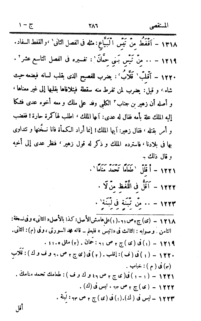 1220 - اقلب قلاب يضْرب للفصيح الَّذِي يقلب لِسَانه فيضعه حَيْثُ شَاءَ وَقيل يضْرب لمن تفرط مِنْهُ سقطة فيتلافاها بقلبها إِلَى غير مَعْنَاهَا وَأَصله أَن زُهَيْر بن جناب الْكَلْبِيّ وَفد على ملك وَمَعَهُ أَخُوهُ عدى فَشَكا إِلَيْهِ الْملك عِلّة بِأُمِّهِ فَقَالَ لَهُ عدي ايها الْملك اطلب لَهَا كمرة حارة فَغَضب وامر بقتْله فَقَالَ زُهَيْر أَيهَا الْملك إِنَّمَا أَرَادَ الكمأة فانا نسخنها ونتداوى بهَا فى بِلَادنَا فاسترده الْملك وَذكر لَهُ قَول زُهَيْر فَنظر عدي إِلَى أَخِيه وَقَالَ ذَلِك