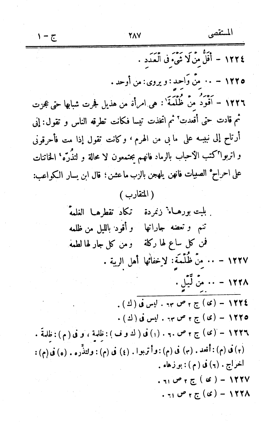 1226 - اقود من ظلمَة هِيَ امْرَأَة من هُذَيْل فجرت شبابها حَتَّى عجزت ثمَّ قادت حَتَّى أقعدت ثمَّ اتَّخذت تَيْسًا فَكَانَت تطرقه النَّاس وَتقول إِنِّي أرتاح إِلَى نبيبه على مَا بى من الْهَرم وَكَانَت تَقول إِذا مت فأحرقونى واتربوا كتب الأحباب بالرماد فَإِنَّهُم يَجْتَمعُونَ لَا محَالة ولتذره الخاتنات على احراح الصبيات فانهن يلهجن يالزب مَا عشن قَالَ ابْن يسَار الكواعب