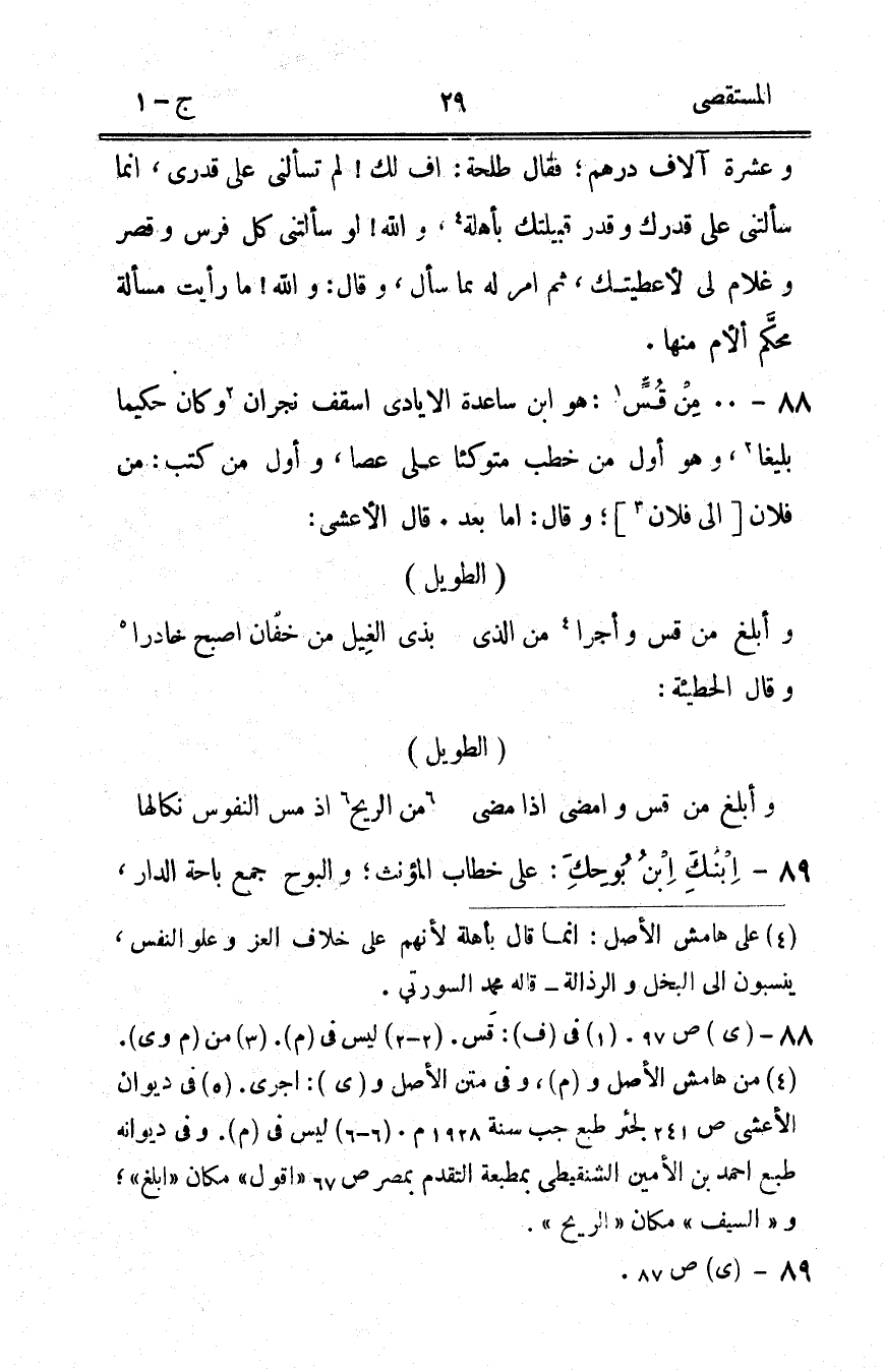 88 - 00 من قس هُوَ ابْن سَاعِدَة الأيادي اسقف نَجْرَان وَكَانَ حكيما بليغا وَهُوَ أول من خطب متوكئا على عَصا وَأول من كتب من فلَان إِلَى فلَان وَقَالَ أما بعد قَالَ الْأَعْشَى