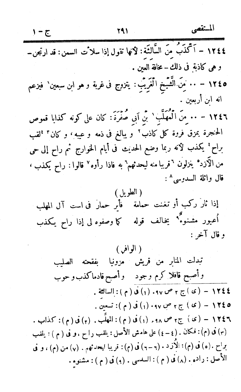 1246 - 00 من الْمُهلب بن ابي صفرَة كَانَ على كَونه كذابا قموص الحنجرة يمزق فَرْوَة كل كَاذِب ويبالغ فى ذمه وعيبه وَكَانَ لقب براح يكذب لِأَنَّهُ رُبمَا وضع الحَدِيث فِي أَيَّام الْخَوَارِج ثمَّ رَاح إِلَى حَيّ من الازد ينزلون قَرِيبا مِنْهُ ليحدثهم بِهِ فَإِذا رَأَوْهُ قَالُوا رَاح يكذب قَالَ وَاثِلَة السدُوسِي