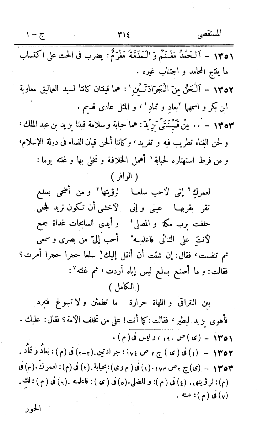 1353 - 00 من قينتي يزِيد هما حبابة وسلامة قَيْنَتَا يزِيد بن عبد الْملك ولحن الْغناء تطريب فِيهِ وتغريد وكانتا أَلحن قيان النِّسَاء فِي دولة الْإِسْلَام وَمن فرط استهتاره لحبابة أهمل الْخلَافَة وتخلى بهَا وغنته يَوْمًا