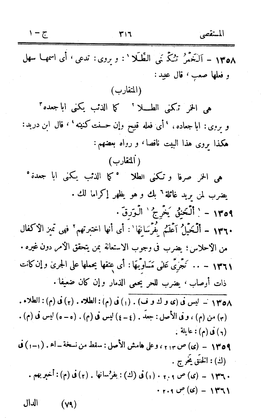 1358 - الْخمر تكنى الطلا ويروى تدعى أى اسْمهَا سهل وفعلها صَعب قَالَ عبيد