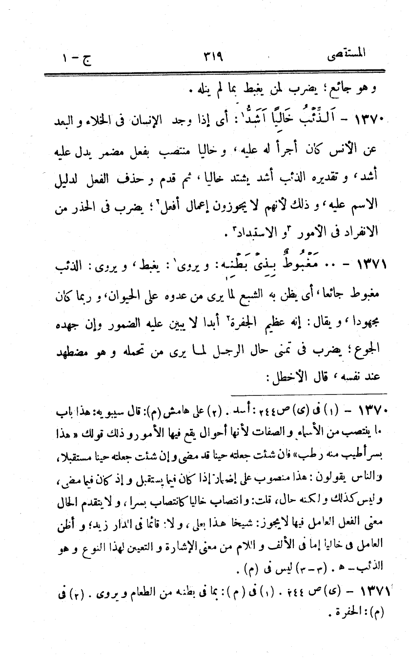1370 - الذِّئْب خَالِيا اشد أَي إِذا وجد الْإِنْسَان فِي الْخَلَاء والبعد عَن الْأنس كَانَ أجرأ لَهُ عَلَيْهِ وخاليا منتصب بِفعل مُضْمر يدل عَلَيْهِ أَشد وَتَقْدِيره الذِّئْب أَشد يشْتَد خَالِيا ثمَّ قدم وَحذف الْفِعْل لدَلِيل الِاسْم عَلَيْهِ وَذَلِكَ لأَنهم لايجوزون إِعْمَال أفعل يضْرب فِي الحذر من الِانْفِرَاد فِي الْأُمُور والاستبداد