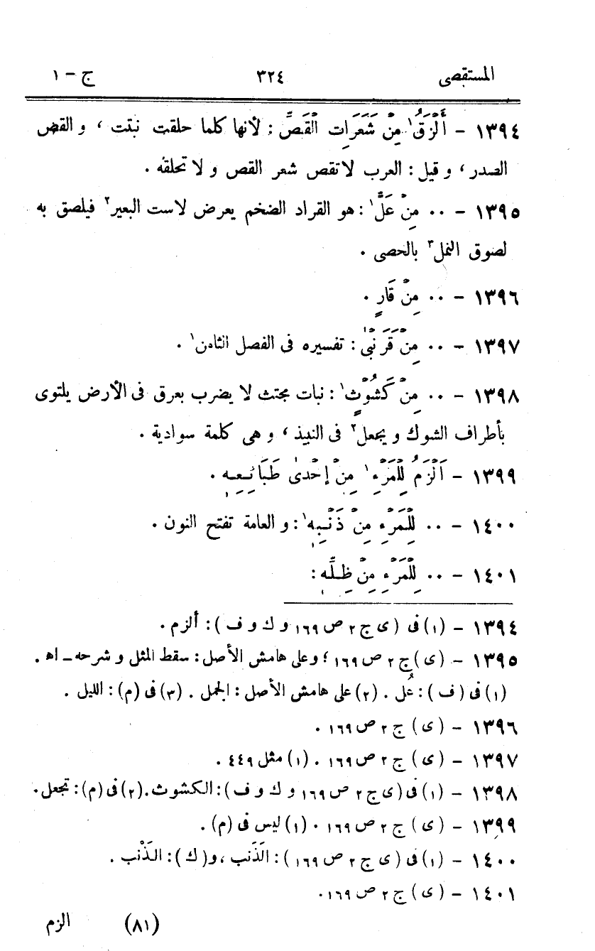1398 - من كشوث نَبَات مجتث لَا يضْرب بعرق فِي الأَرْض يلتوي بأطراف الشوك وَيجْعَل فِي النَّبِيذ وَهِي كلمة سوادية