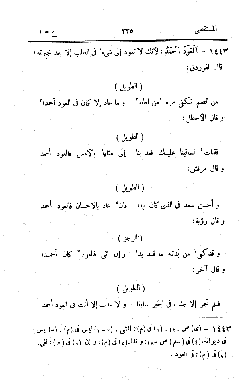 1443 - الْعود احْمَد لِأَنَّك لَا تعود إِلَى شَيْء فِي الْغَالِب إِلَّا بعد خبرته قَالَ الفرزدق