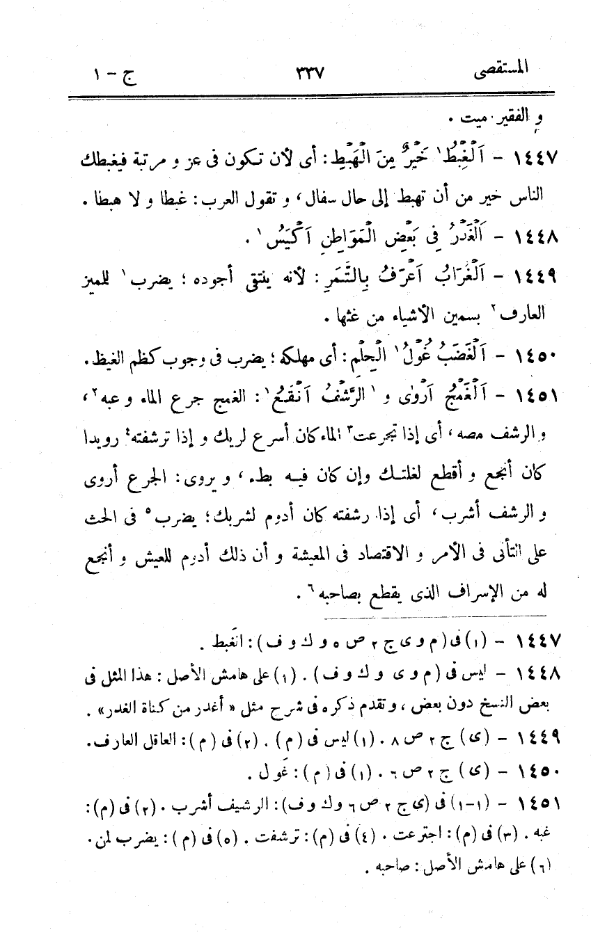 1447 - الْغَبْطُ خير من الهبط أَي لِأَن تكون فِي عز ومرتبة فيغبطك النَّاس خير من أَن تهبط إِلَى حَال سفال وَتقول الْعَرَب غبطا وَلَا هبطا