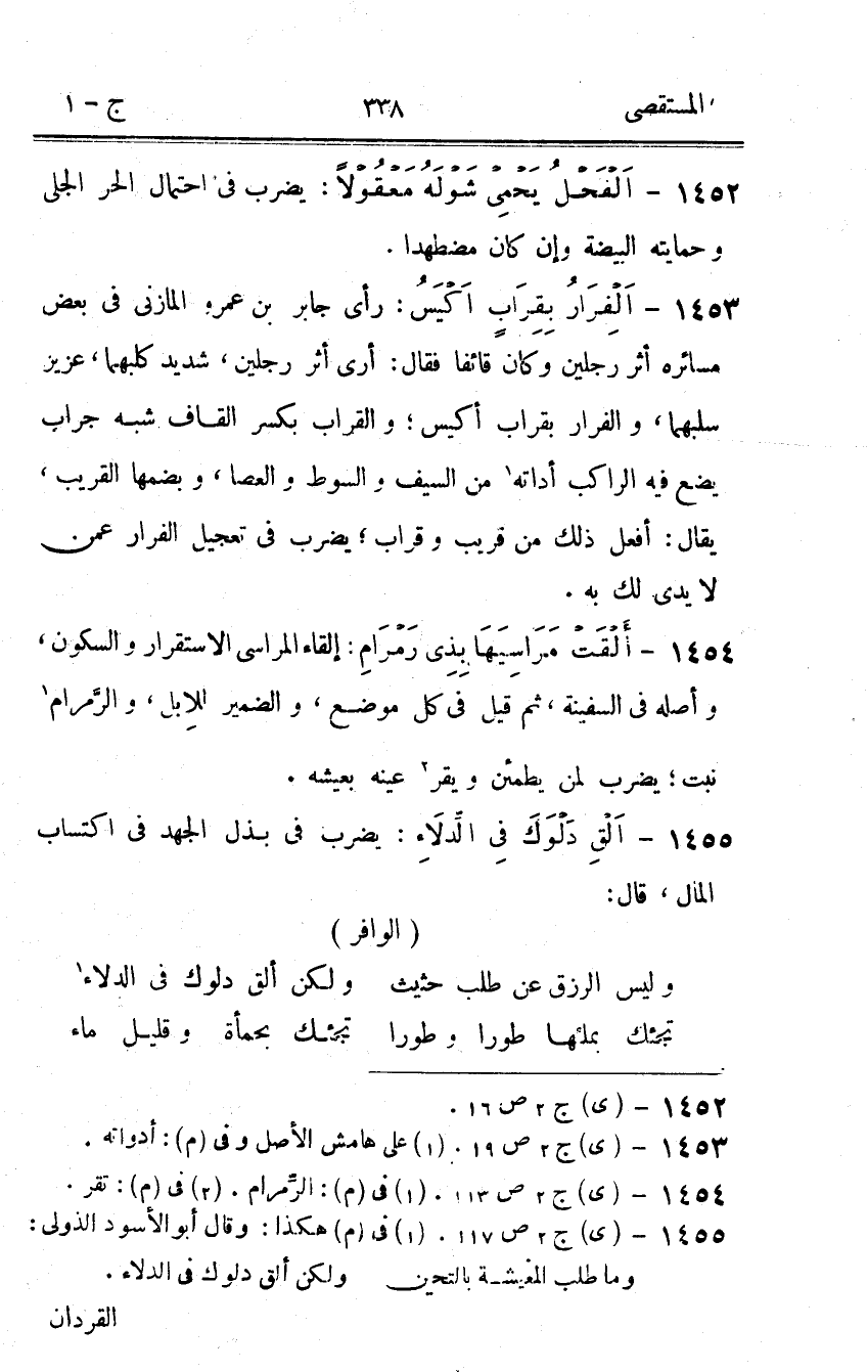 1453 - الْفِرَار بقراب اكيس رأى جَابر بن عَمْرو الْمَازِني فِي بعض مسائره أثر رجلَيْنِ وَكَانَ قائفا فَقَالَ أرى أثر رجلَيْنِ شَدِيد كلبهما عَزِيز سلبهما والفرار بقراب أَكيس والقراب بِكَسْر الْقَاف شبه جراب يضع فِيهِ الرَّاكِب أداته من السَّيْف وَالسَّوْط والعصا وَبِضَمِّهَا الْقَرِيب يُقَال أفعل ذَلِك من قريب وقراب يضْرب فِي تَعْجِيل الْفِرَار عَمَّن لَا يدى لَك بِهِ