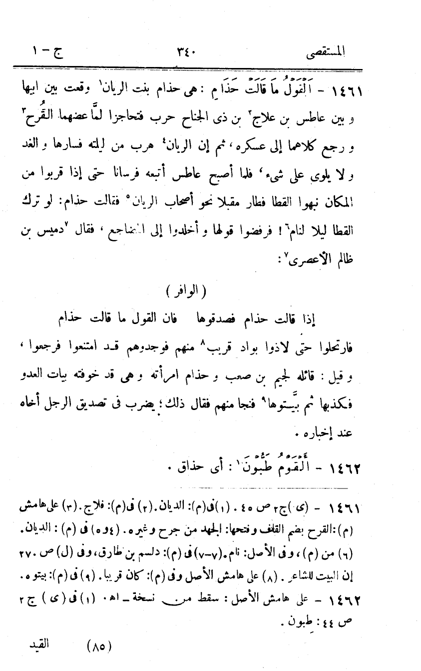 1461 - القَوْل مَا قَالَت حذام هِيَ حذام بنت الريان وَقعت بَين ابيها وَبَين عاطس بن علاج بن ذِي الْجنَاح حَرْب فتحاجزا لما عضهما الْقرح وَرجع كِلَاهُمَا إِلَى عسكره ثمَّ إِن الريان هرب من ليلته فسارها والغد وَلَا يلوي على شَيْء فَلَمَّا اصبح عاطس أتبعه فُرْسَانًا حَتَّى إِذا قربوا من الْمَكَان نبهوا القطا فطار مُقبلا نَحْو أَصْحَاب الريان فَقَالَت حذام لَو ترك القطا لَيْلًا لنام فَرَفَضُوا قَوْلهَا وأخلدوا إِلَى الْمضَاجِع فَقَالَ دميس بن ظَالِم الأعصري