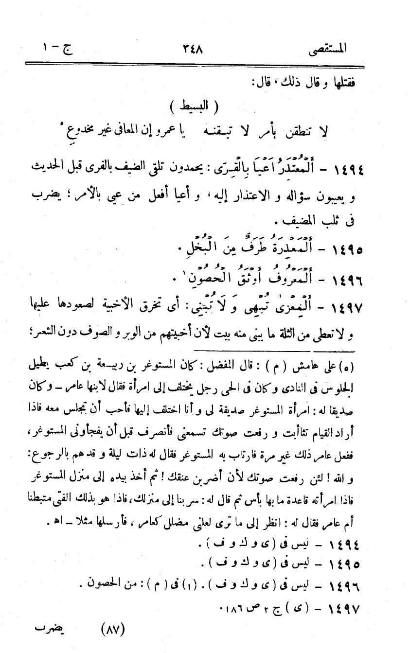 1494 - ألمعتذر اعيا بالقرى يحْمَدُونَ تلقي الضَّيْف بالقرى قبل الحَدِيث ويعيبون سُؤَاله والاعتذار إِلَيْهِ وأعيا أفعل من عيي بِالْأَمر يضْرب فِي ثلب المضيف