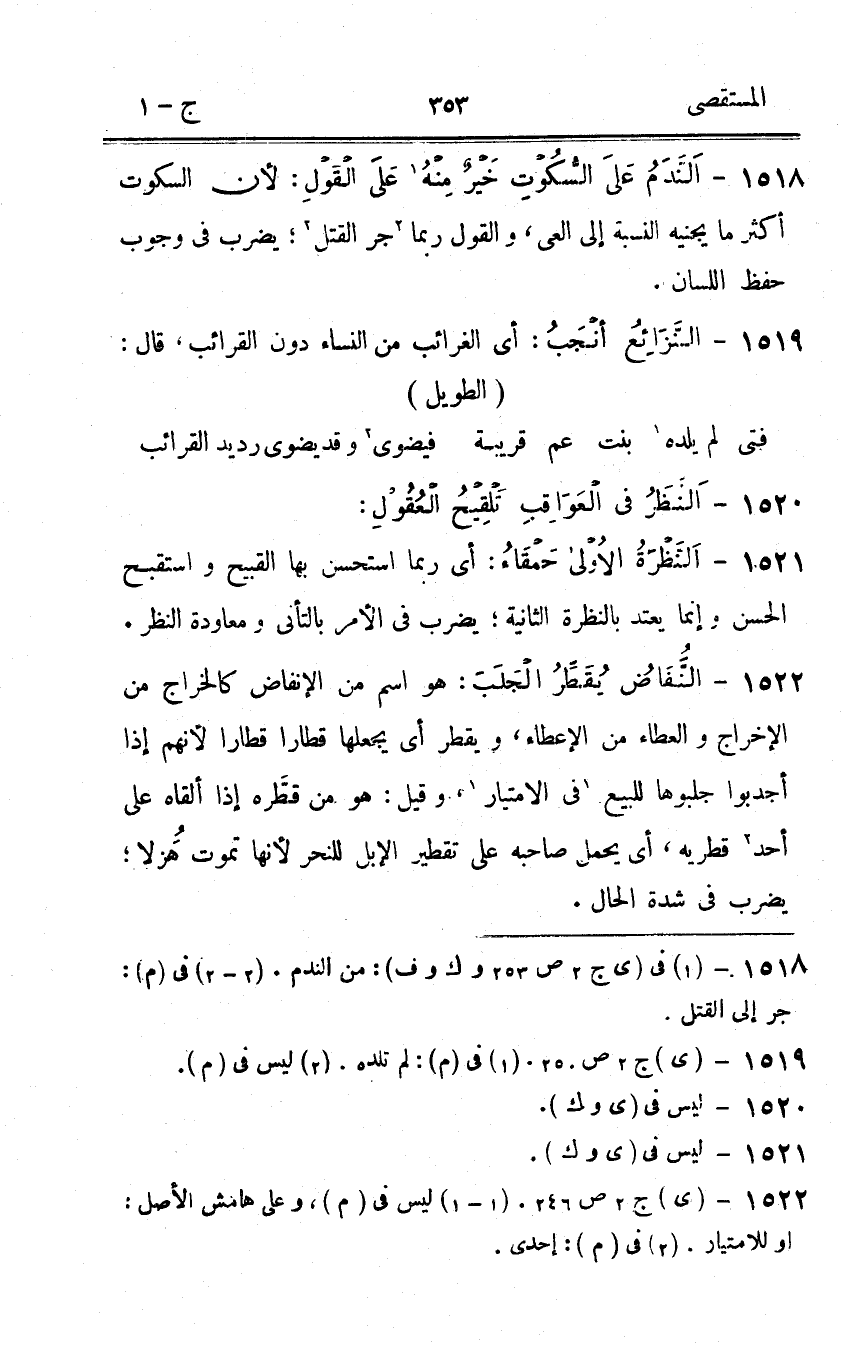 1518 - النَّدَم على السُّكُوت خير مِنْهُ على القَوْل لِأَن السُّكُوت أَكثر مَا يجنيه النِّسْبَة إِلَى العي وَالْقَوْل رُبمَا جر الْقَتْل يضْرب فِي وجوب حفظ اللِّسَان