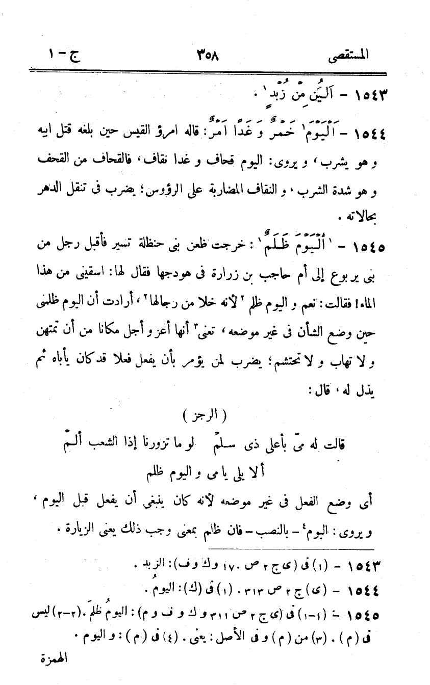 1545 - أليوم ظلم خرجت ظعن بني حَنْظَلَة تسير فَأقبل رجل من بني يَرْبُوع إِلَى أم حَاجِب بن زُرَارَة فى هودجها فَقَالَ لَهَا اسقيني من هَذَا المَاء فَقَالَت نعم واليم ظلم لِأَنَّهُ خلا من رجالها أَرَادَت أَن الْيَوْم ظلمنى حِين وضع الشَّأْن فى غير مَوْضِعه تَعْنِي أَنَّهَا أعز وَأجل مَكَانا من أَن تمتهن وَلَا تهاب وَلَا تحتشم يضْرب لمن يُؤمر بِأَن يفعل فعلا قد كَانَ يأباه ثمَّ يذل لَهُ قَالَ