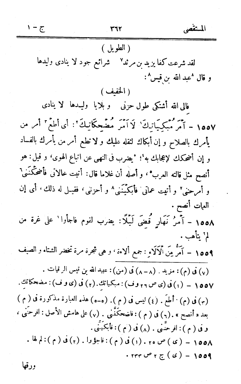 1557 - امْر مبكياتك لَا امْر مضحكاتك أَي أطع أَمر من يَأْمُرك بالصلاح وَإِن أبكاك لثقله عَلَيْك وَلَا تُطِع أَمر من يَأْمُرك بِالْفَسَادِ وَإِن أضْحكك لإعجابك بِهِ يضْرب فِي النَّهْي عَن اتِّبَاع الْهوى وَقيل هُوَ أنصح مثل قالته الْعَرَب وَأَصله أَن غُلَاما قَالَ أتيت خالاتى فأضحكنني وأمرحنني وأتيت عماتي فأبكينني وأحزنني فَقيل لَهُ ذَلِك أَي إِن العمات أنصح