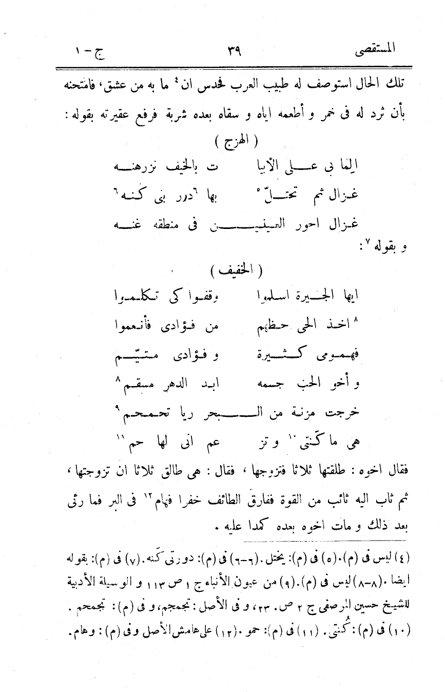 تِلْكَ الْحَال استوصف لَهُ طَبِيب الْعَرَب فحدس أَن مَا بِهِ من عشق فامتحنه بِأَن ثرد لَهُ فِي خمر وأطعمه إاياه وسقاه بعده شربة فَرفع عقيرته بقوله