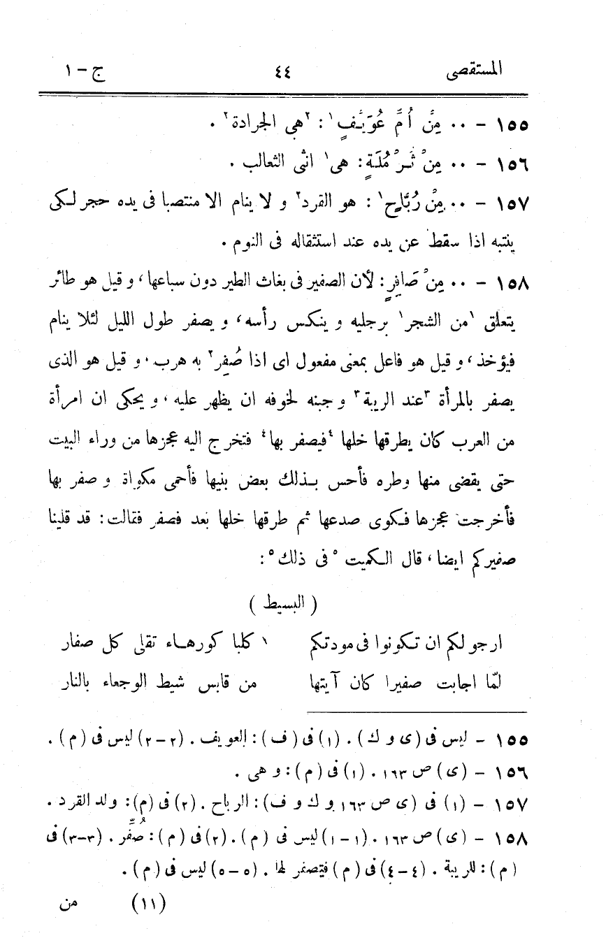 158 - من صافر لِأَن الصفير فِي بغاث الطير دون سباعها وَقيل هُوَ طَائِر يتَعَلَّق من الشّجر برجليه وينكس رَأسه ويصفر طول اللَّيْل لِئَلَّا ينَام فَيُؤْخَذ وَقيل هُوَ فَاعل بِمَعْنى مفعول أَي إِذا صفر بِهِ هرب وَقيل هُوَ الَّذِي يصفر بِالْمَرْأَةِ عِنْد الرِّيبَة وجبنه لخوفه أَن يظْهر عَلَيْهِ ويحكى ان امْرَأَة من الْعَرَب كَانَ يطرقها خلها فيصفر بهَا فَتخرج إِلَيْهِ عجزها من وَرَاء الْبَيْت حَتَّى يقْضى مِنْهَا وطره فأحس بذلك بعض بنيها فأحمى مكواة وصفر بهَا فأخرجت عجزها فكوى صَدعهَا ثمَّ طرقها خلها بعد فصفر فَقَالَت قد قلينا صفيركم أَيْضا قَالَ الْكُمَيْت فى ذَلِك