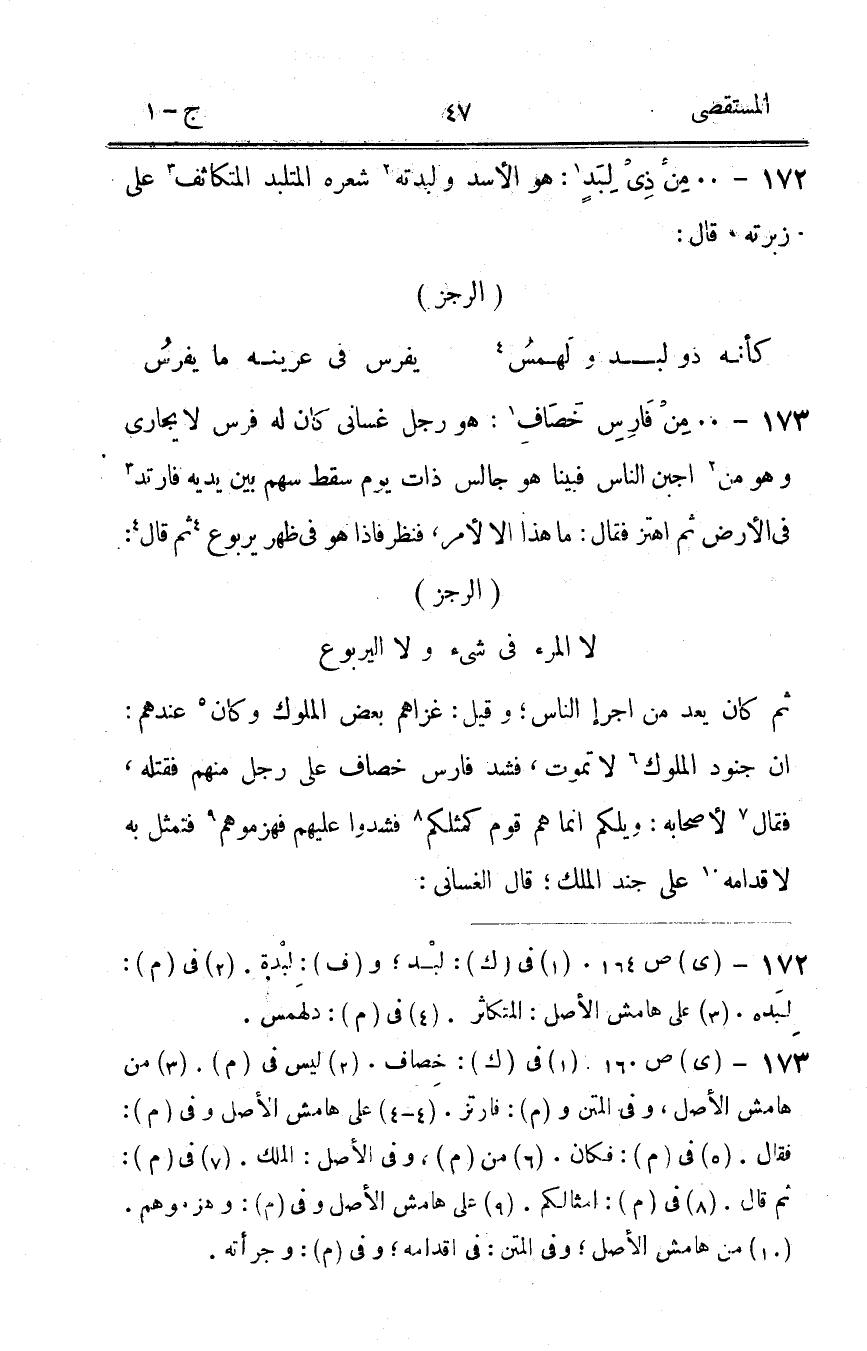 173 - من فَارس خصاف هُوَ رجل غساني كَانَ لَهُ فرس لَا يجارى وَهُوَ من أجبن النَّاس فَبينا هُوَ جَالس ذَات يَوْم سقط سهم بَين يَدَيْهِ فَارْتَد فى الأَرْض ثمَّ اهتز فَقَالَ مَا هَذَا إِلَّا لأمر فَنظر فَإِذا هُوَ فِي ظهر يَرْبُوع ثمَّ قَالَ