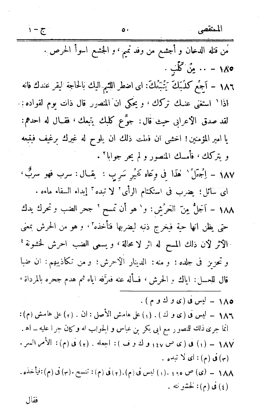186 - اجع كلبك يتبعك اى اضْطر اللَّئِيم اليك بِالْحَاجةِ لِيُقِر عنْدك فَإِنَّهُ اذا اسْتغنى عَنْك تَركك ويحكى ان الْمَنْصُور قَالَ ذَات يَوْم لقواده لقد صدق الأعرابى حَيْثُ قَالَ جوع كلبك يتبعك فَقَالَ لَهُ احدهم يَا امير الْمُؤمنِينَ اخشى ان فعلت ذَلِك ان يلوح لَهُ غَيْرك برغيف فيتبعه ويتركك فَأمْسك الْمَنْصُور وَلم يحر جَوَابا