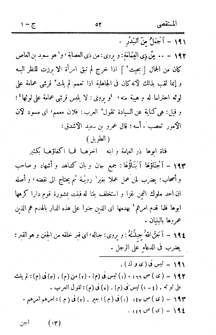 192 - 00 من ذِي الْعِمَامَة ويروى من ذى الْعِصَابَة وَهُوَ سعيد بن الْعَاصِ كَانَ من الْجمال بِحَيْثُ اذا خرج لم تبْق امْرَأَة الا برزت للنَّظَر اليه وَإِنَّمَا لقب بذلك لِأَنَّهُ كَانَ فِي الْجَاهِلِيَّة اذا تعمم لم يلث قرشى عِمَامَة على لوثه احتراما لَهُ وهيبة مِنْهُ ويروى لَا يلبس قرشي عِمَامَة على لوثها وَقيل هِيَ كِنَايَة عَن السِّيَادَة تَقول الْعَرَب فلَان معمم اى مسود لِأَن الْأُمُور تعصب بِرَأْسِهِ قَالَ عَمْرو بن سعيد الْأَشْدَق
