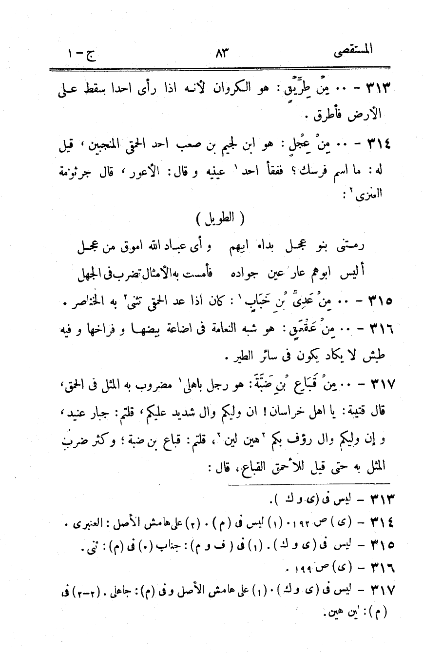 314 - 00 من عجل هُوَ ابْن لجيم بن صَعب اُحْدُ الحمقى المنجبين قيل لَهُ مَا اسْم فرسك ففقأ اُحْدُ عَيْنَيْهِ وَقَالَ الْأَعْوَر قَالَ جرثومة العنزى
