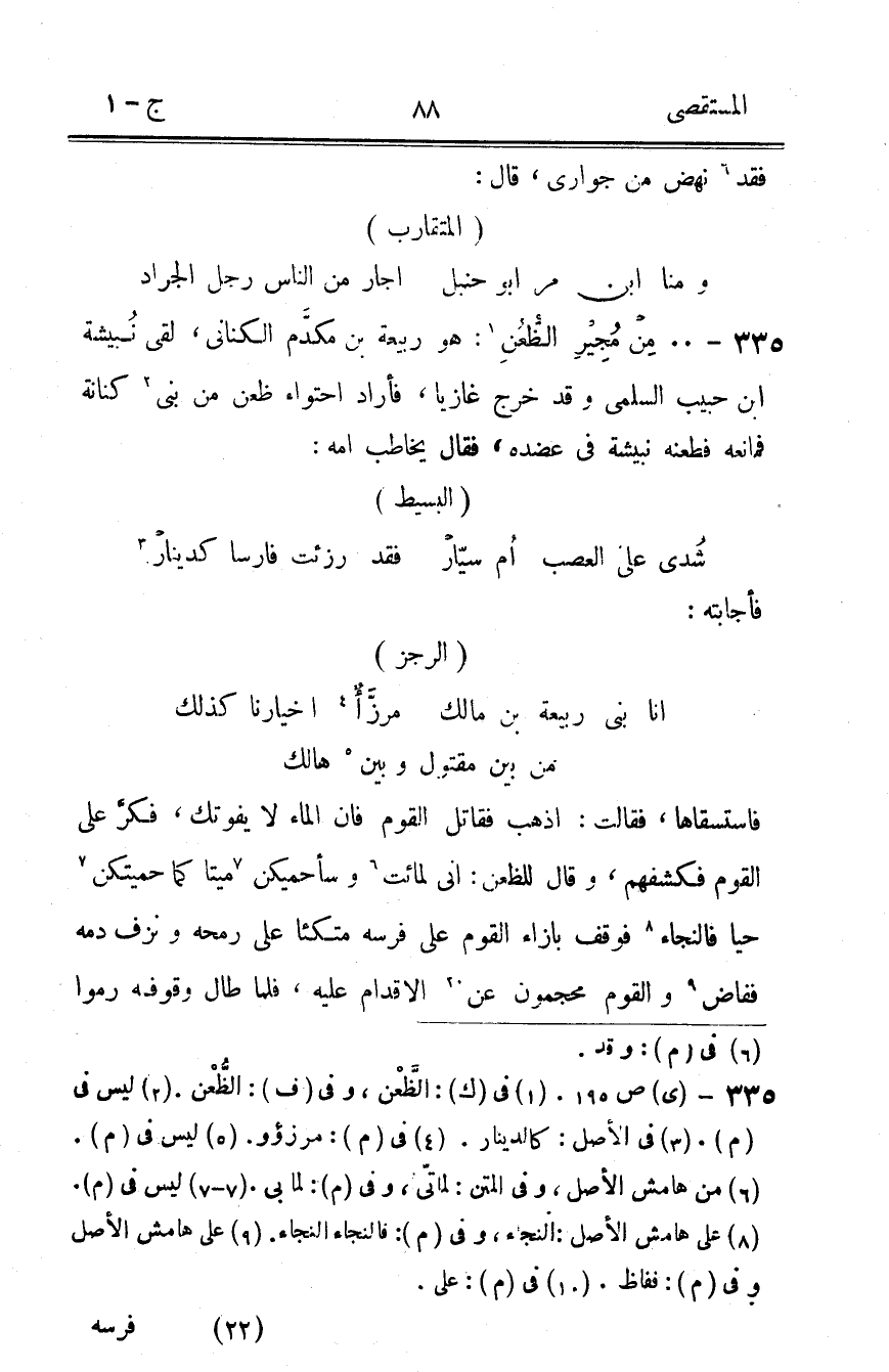 335 - 00 من مجير الظعن هُوَ ربيعَة بن مكدم الْكِنَانِي لقى نُبَيْشَة بن حبيب السّلمِيّ وَقد خرج غازيا فَأَرَادَ احتواء ظعن من بني كنَانَة فمانعه قطعته نُبَيْشَة فِي عضده فَقَالَ يُخَاطب امهِ