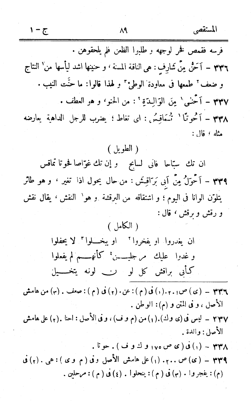 339 - احول من ابى براقش من حَال يحول اذا تغير وَهُوَ طَائِر يَتلون ألوانا فِي الْيَوْم واشتقاقه من البرقشة وَهُوَ النقش يُقَال نقش ورقش وبرقش قَالَ