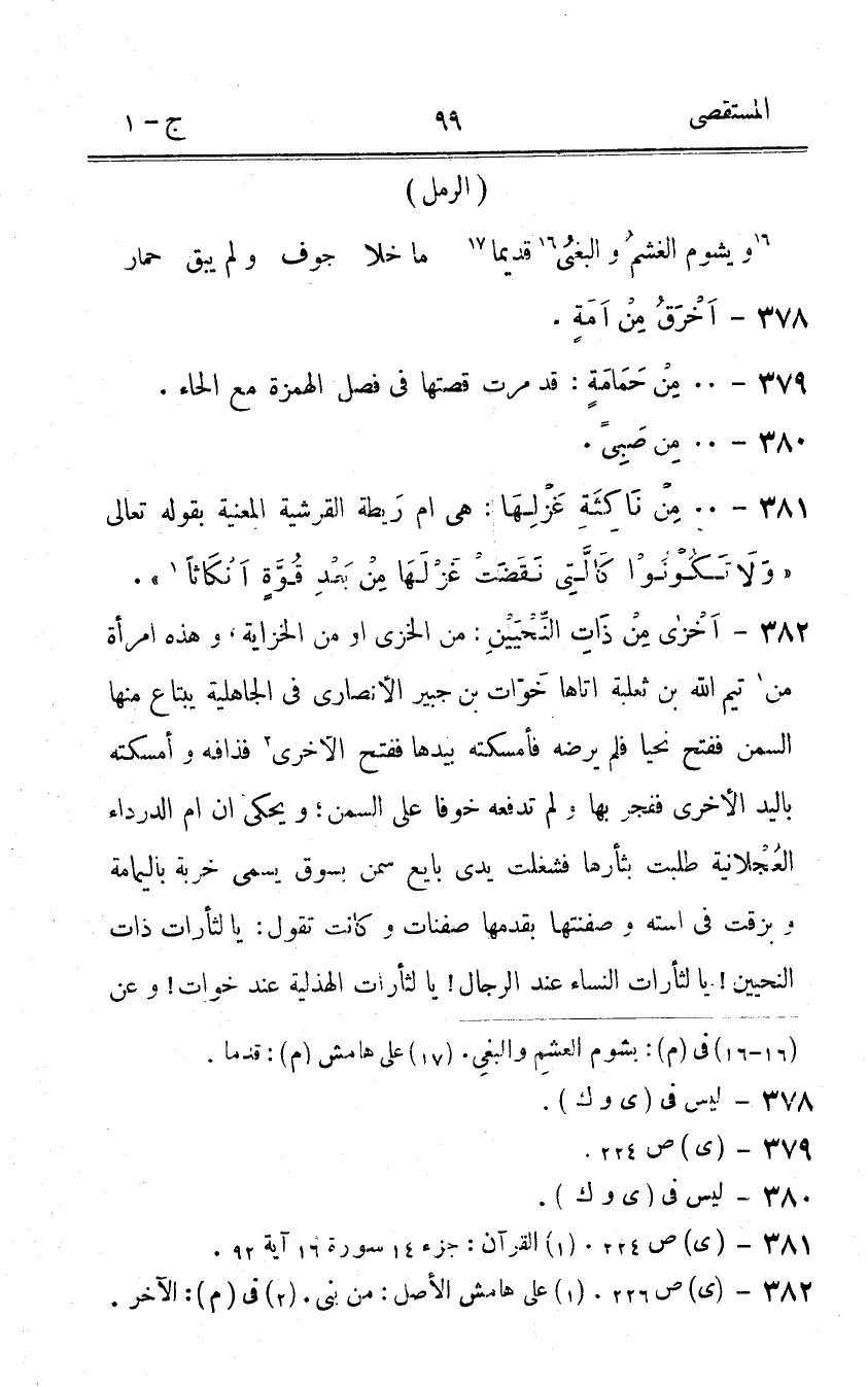 382 - اخزى من ذَات النحيين من الخزي اَوْ من الخزاية وَهَذِه امْرَأَة من تيم الله بن ثَعْلَبَة اتاها خَوات بن جُبَير الْأنْصَارِيّ فِي الْجَاهِلِيَّة يبْتَاع مِنْهَا السّمن فَفتح نحيا فَلم يرضه فأمسكته بِيَدِهَا فَفتح الْأُخْرَى فذافه وأمسكته بِالْيَدِ الْأُخْرَى ففجر بهَا وَلم تَدْفَعهُ خوفًا على السّمن ويحكى ان ام الدَّرْدَاء العجلانية طلبت بثأرها فشغلت يدى بَايع سمن بسوق يُسمى خربة بِالْيَمَامَةِ وبزقت فى استه وصفنتها بقدمها صفنات وَكَانَت تَقول يَا لثأرات ذَات النحيين يَا لثأرات النِّسَاء عِنْد الرِّجَال يَا لثأرات الهذلية عِنْد خَوات وَعَن