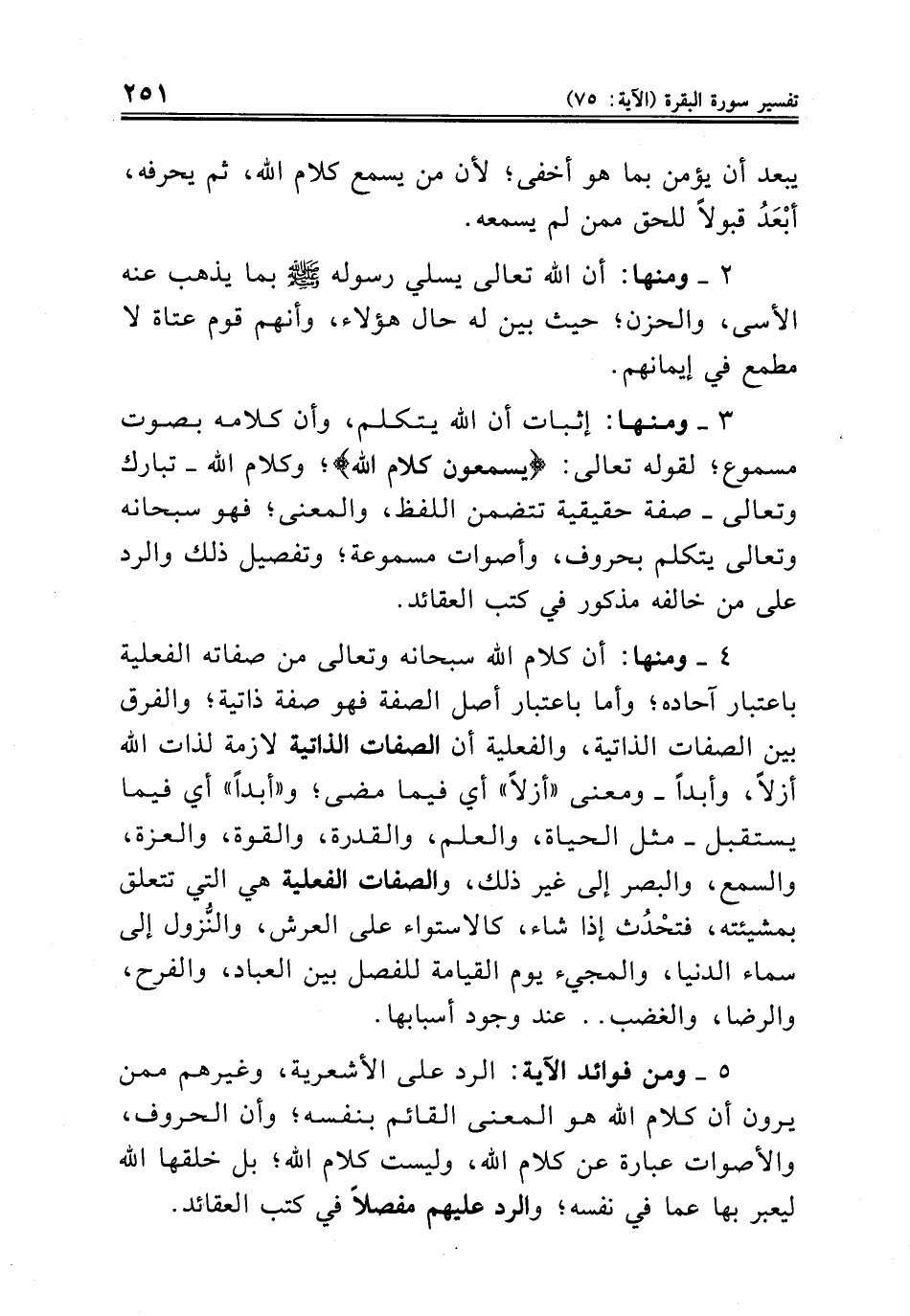 ٤ ومنها: أن كلام الله سبحانه وتعالى من صفاته الفعلية باعتبار آحاده؛ وأما باعتبار أصل الصفة فهو صفة ذاتية؛ والفرق بين الصفات الذاتية، والفعلية أن الصفات الذاتية لازمة لذات الله أزلاً، وأبداً. ومعنى "أزلاً" أي فيما مضى؛ و"أبداً" أي فيما يستقبل. مثل الحياة، والعلم، والقدرة، والقوة، والعزة، والسمع، والبصر إلى غير ذلك، والصفات الفعلية هي التي تتعلق بمشيئته، فتحْدُث إذا شاء، كالاستواء على العرش، والنُّزول إلى سماء الدنيا، والمجيء يوم القيامة للفصل بين العباد، والفرح، والرضا، والغضب .. عند وجود أسبابها ..