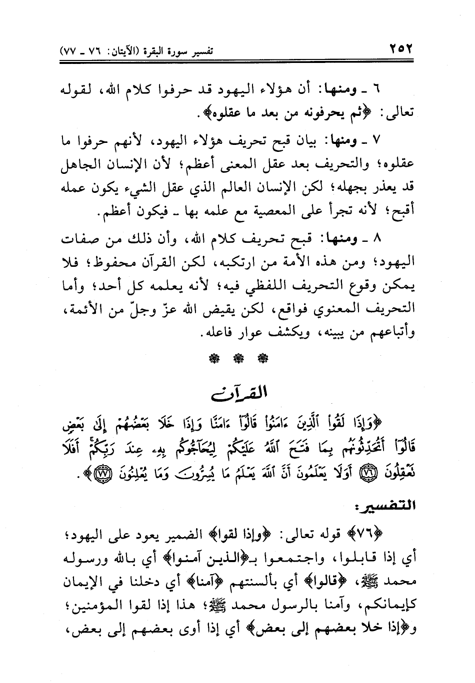 . ٨ ومنها: قبح تحريف كلام الله، وأن ذلك من صفات اليهود؛ ومن هذه الأمة من ارتكبه، لكن القرآن محفوظ؛ فلا يمكن وقوع التحريف اللفظي فيه؛ لأنه يعلمه كل أحد؛ وأما التحريف المعنوي فواقع، لكن يقيض الله عزّ وجلّ من الأئمة، وأتباعهم من يبينه، ويكشف عوار فاعله ..