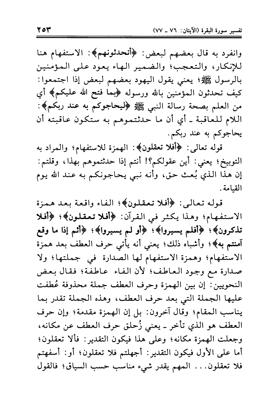 قوله تعالى: {أفلا تعقلون}؛ الفاء واقعة بعد همزة الاستفهام؛ وهذا يكثر في القرآن: {أفلا تعقلون}؛ {أفلا تذكرون}؛ {أفلم يسيروا}؛ {أو لم يسيروا}؛ {أثم إذا ما وقع آمنتم به}؛ وأشباه ذلك؛ يعني أنه يأتي حرف العطف بعد همزة الاستفهام؛ وهمزة الاستفهام لها الصدارة في جملتها؛ ولا صدارة مع وجود العاطف؛ لأن الفاء عاطفة؛ فقال بعض النحويين: إن بين الهمزة وحرف العطف جملة محذوفة عُطفت عليها الجملة التي بعد حرف العطف، وهذه الجملة تقدر بما يناسب المقام؛ وقال آخرون: بل إن الهمزة مقدمة؛ وإن حرف العطف هو الذي تأخر. يعني زُحلق حرف العطف عن مكانه، وجعلت الهمزة مكانه؛ وعلى هذا فيكون التقدير: فألا تعقلون؛ أما على الأول فيكون التقدير: أجهلتم فلا تعقلون؛ أو: أسفهتم فلا تعقلون ... المهم يقدر شيء مناسب حسب السياق؛ فالقول