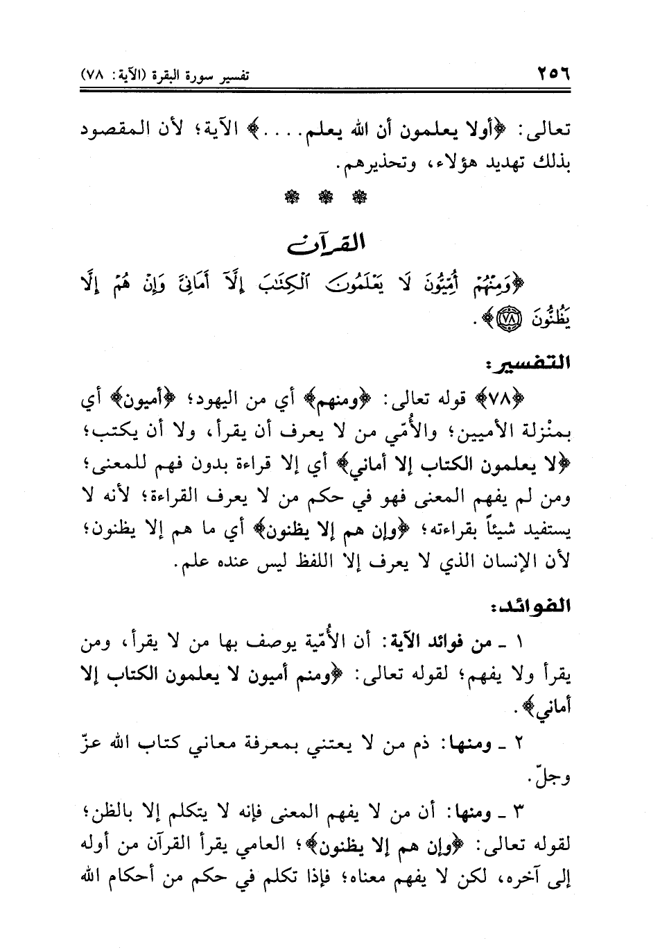 . {٧٨} قوله تعالى: {ومنهم} أي من اليهود؛ {أميون} أي بمنْزلة الأميين؛ والأُمّي من لا يعرف أن يقرأ، ولا أن يكتب؛ {لا يعلمون الكتاب إلا أماني} أي إلا قراءة بدون فهم للمعنى؛ ومن لم يفهم المعنى فهو في حكم من لا يعرف القراءة؛ لأنه لا يستفيد شيئاً بقراءته؛ {وإن هم إلا يظنون} أي ما هم إلا يظنون؛ لأن الإنسان الذي لا يعرف إلا اللفظ ليس عنده علم ..