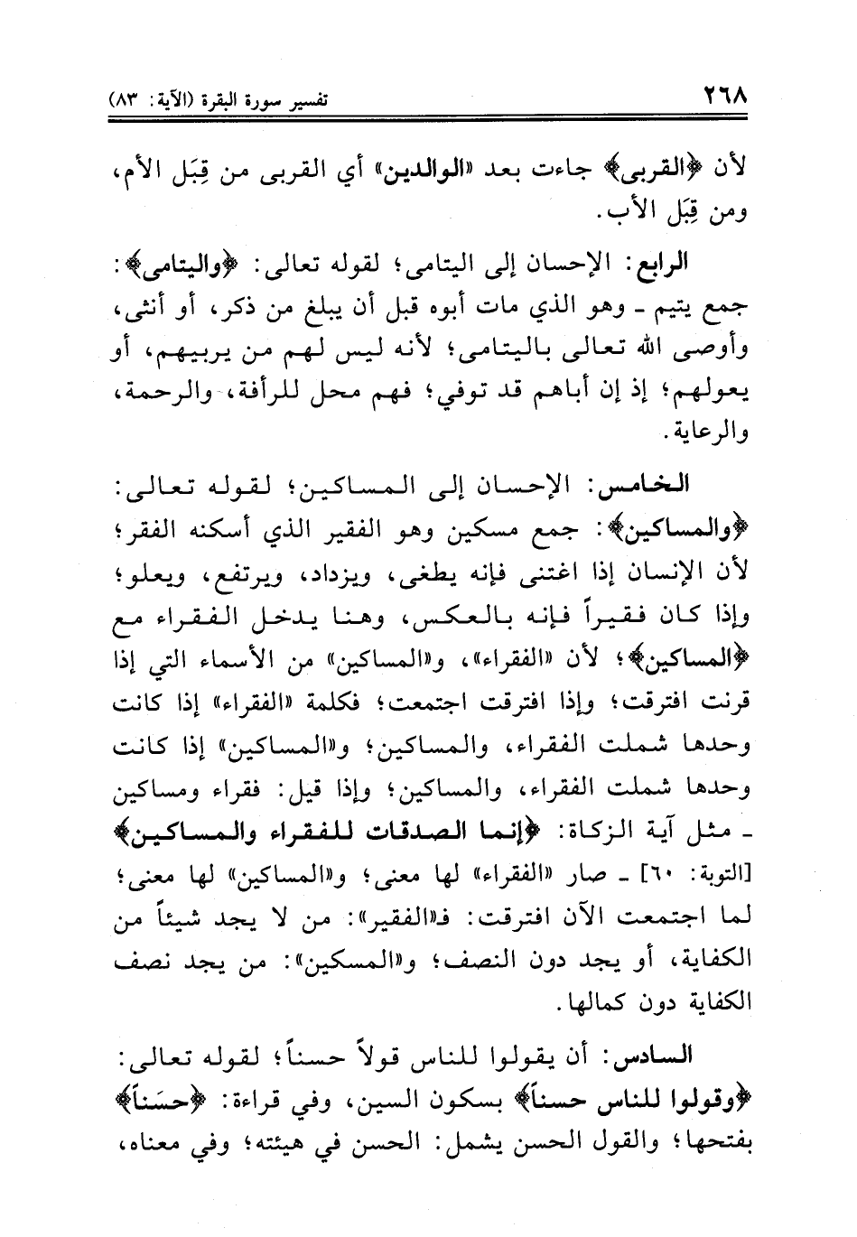 الخامس: الإحسان إلى المساكين؛ لقوله تعالى: {والمساكين}: جمع مسكين وهو الفقير الذي أسكنه الفقر؛ لأن الإنسان إذا اغتنى فإنه يطغى، ويزداد، ويرتفع، ويعلو؛ وإذا كان فقيراً فإنه بالعكس، وهنا يدخل الفقراء مع {المساكين}؛ لأن "الفقراء"، و"المساكين" من الأسماء التي إذا قرنت افترقت؛ وإذا افترقت اجتمعت؛ فكلمة "الفقراء" إذا كانت وحدها شملت الفقراء، والمساكين؛ و"المساكين" إذا كانت وحدها شملت الفقراء، والمساكين؛ وإذا قيل: فقراء ومساكين. مثل آية الزكاة: {إنما الصدقات للفقراء والمساكين} [التوبة: ٦٠]. صار "الفقراء" لها معنى؛ و"المساكين" لها معنى؛ لما اجتمعت الآن افترقت: فـ"الفقير": من لا يجد شيئاً من الكفاية، أو يجد دون النصف؛ و"المسكين": من يجد نصف الكفاية دون كمالها ..