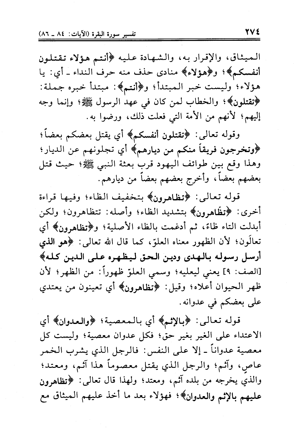 وقوله تعالى: {تقتلون أنفسكم} أي يقتل بعضكم بعضاً؛ {وتخرجون فريقاً منكم من ديارهم} أي تجلونهم عن الديار؛ وهذا وقع بين طوائف اليهود قرب بعثة النبي صلى الله عليه وسلم حيث قتل بعضهم بعضاً، وأخرج بعضهم بعضاً من ديارهم ..