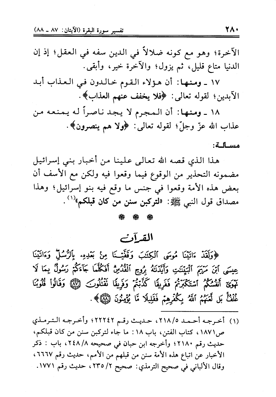 (وَلَقَدْ آتَيْنَا مُوسَى الْكِتَابَ وَقَفَّيْنَا مِنْ بَعْدِهِ بِالرُّسُلِ وَآتَيْنَا عِيسَى ابْنَ مَرْيَمَ الْبَيِّنَاتِ وَأَيَّدْنَاهُ بِرُوحِ الْقُدُسِ أَفَكُلَّمَا جَاءَكُمْ رَسُولٌ بِمَا لا تَهْوَى أَنْفُسُكُمُ اسْتَكْبَرْتُمْ فَفَرِيقاً كَذَّبْتُمْ وَفَرِيقاً تَقْتُلُونَ) (البقرة: ٨٧) وَقَالُوا قُلُوبُنَا غُلْفٌ بَلْ لَعَنَهُمُ اللَّهُ بِكُفْرِهِمْ فَقَلِيلاً مَا يُؤْمِنُونَ) (البقرة: ٨٨)