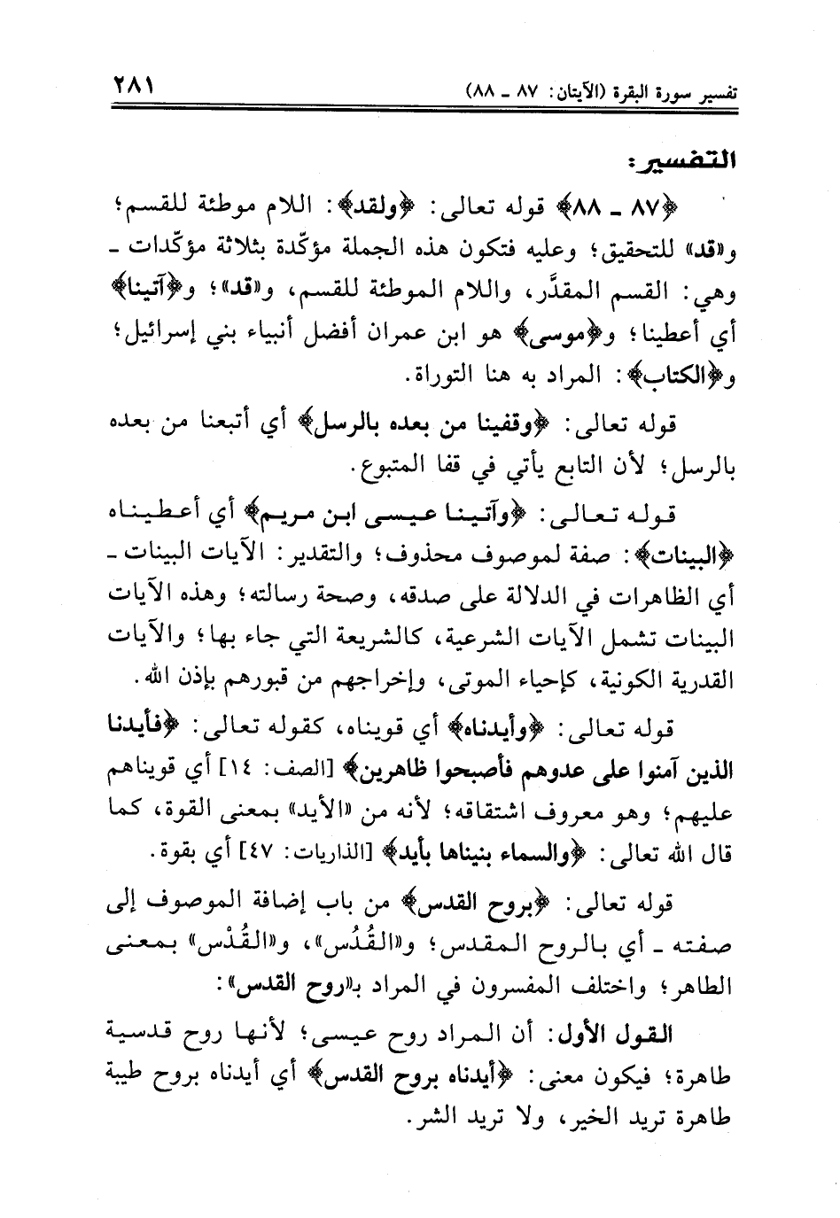 القول الأول: أن المراد روح عيسى؛ لأنها روح قدسية طاهرة؛ فيكون معنى: {أيدناه بروح القدس} أي أيدناه بروح طيبة طاهرة تريد الخير، ولا تريد الشر ..