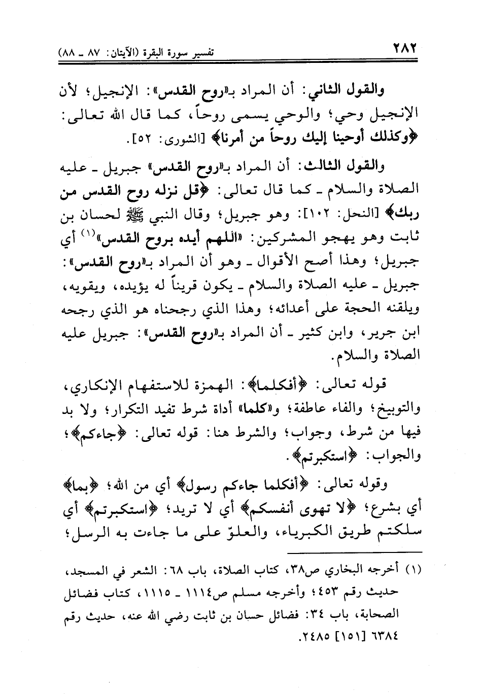 والقول الثالث: أن المراد بـ "روح القدس" جبريل. عليه الصلاة والسلام. كما قال تعالى: {قل نزله روح القدس من ربك} [النحل: ١٠٢]: وهو جبريل؛ وقال النبي صلى الله عليه وسلم لحسان بن ثابت وهو يهجو المشركين: "اللهم أيده بروح القدس" (¬١) أي جبريل؛ وهذا أصح الأقوال. وهو أن المراد بـ "روح القدس": جبريل. عليه الصلاة والسلام. يكون قريناً له يؤيده، ويقويه، ويلقنه الحجة على أعدائه؛ وهذا الذي رجحناه هو الذي رجحه ابن جرير، وابن كثير. أن المراد بـ "روح القدس": جبريل عليه الصلاة والسلام ..