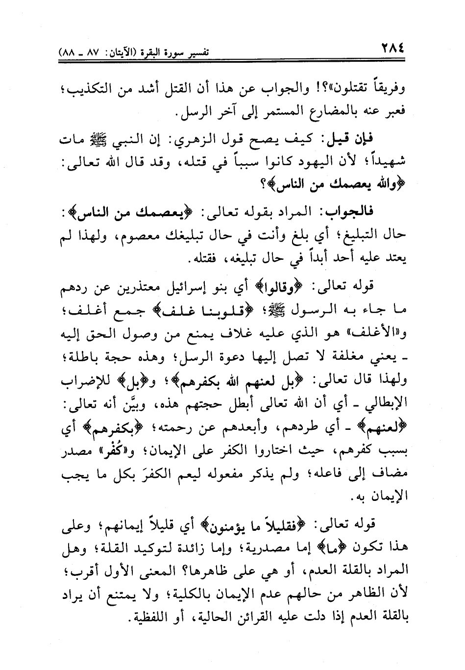 قوله تعالى: {وقالوا} أي بنو إسرائيل معتذرين عن ردهم ما جاء به الرسول صلى الله عليه وسلم؛ {قلوبنا غلف} جمع أغلف؛ و"الأغلف" هو الذي عليه غلاف يمنع من وصول الحق إليه. يعني مغلفة لا تصل إليها دعوة الرسل؛ وهذه حجة باطلة؛ ولهذا قال تعالى: {بل لعنهم الله بكفرهم}؛ و {بل} للإضراب الإبطالي. أي أن الله تعالى أبطل حجتهم هذه، وبيَّن أنه تعالى: {لعنهم}. أي طردهم، وأبعدهم عن رحمته؛ {بكفرهم} أي بسبب كفرهم، حيث اختاروا الكفر على الإيمان؛ و "كُفْر" مصدر مضاف إلى فاعله؛ ولم يذكر مفعوله ليعم الكفرَ بكل ما يجب الإيمان به ..