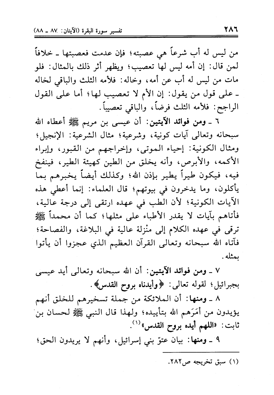 . ٧ ومن فوائد الآيتين: أن الله سبحانه وتعالى أيد عيسى بجبرائيل؛ لقوله تعالى: {وأيدناه بروح القدس ..