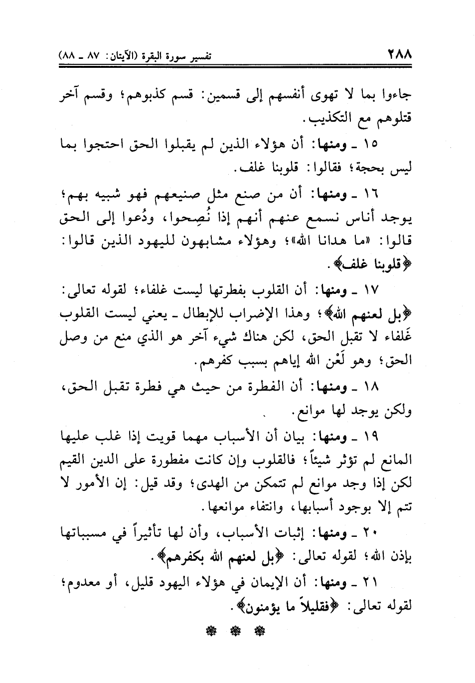 . ١٧ ومنها: أن القلوب بفطرتها ليست غلفاء؛ لقوله تعالى: {بل لعنهم الله}؛ وهذا الإضراب للإبطال. يعني ليست القلوب غَلفاء لا تقبل الحق، لكن هناك شيء آخر هو الذي منع من وصل الحق؛ وهو لَعْن الله إياهم بسبب كفرهم ..