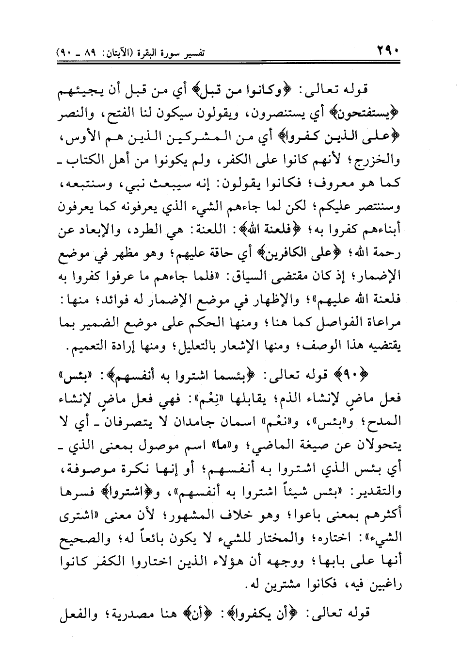 . {٩٠} قوله تعالى: {بئسما اشتروا به أنفسهم}: "بئس" فعل ماضٍ لإنشاء الذم؛ يقابلها "نِعْم": فهي فعل ماضٍ لإنشاء المدح؛ و"بئس"، و"نعْم" اسمان جامدان لا يتصرفان. أي لا يتحولان عن صيغة الماضي؛ و "ما" اسم موصول بمعنى الذي. أي بئس الذي اشتروا به أنفسهم؛ أو إنها نكرة موصوفة، والتقدير: "بئس شيئاً اشتروا به أنفسهم"، و {اشتروا} فسرها أكثرهم بمعنى باعوا؛ وهو خلاف المشهور؛ لأن معنى "اشترى الشيء": اختاره؛ والمختار للشيء لا يكون بائعاً له؛ والصحيح أنها على بابها؛ ووجهه أن هؤلاء الذين اختاروا الكفر كانوا راغبين فيه، فكانوا مشترين له ..
