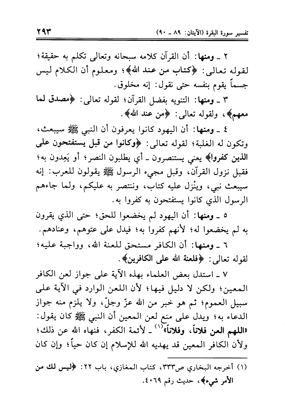 . ٧. استدل بعض العلماء بهذه الآية على جواز لعن الكافر المعين؛ ولكن لا دليل فيها؛ لأن اللعن الوارد في الآية على سبيل العموم؛ ثم هو خبر من الله عزّ وجلّ، ولا يلزم منه جواز الدعاء به؛ ويدل على منع لعن المعين أن النبي صلى الله عليه وسلم كان يقول: "اللهم العن فلاناً، وفلاناً" (¬١). لأئمة الكفر، فنهاه الله عن ذلك؛ ولأن الكافر المعين قد يهديه الله للإسلام إن كان حياً؛ وإن كان