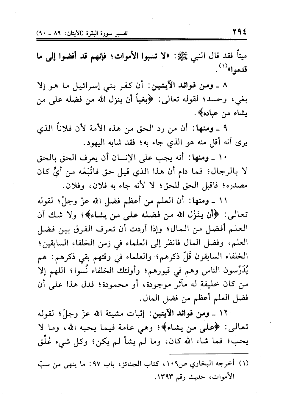 ١١ ومنها: أن العلم من أعظم فضل الله عزّ وجلّ؛ لقوله تعالى: {أن ينَزِّل الله من فضله على من يشاء}؛ ولا شك أن العلم أفضل من المال؛ وإذا أردت أن تعرف الفرق بين فضل العلم، وفضل المال فانظر إلى العلماء في زمن الخلفاء السابقين؛ الخلفاء السابقون قَلّ ذكرهم؛ والعلماء في وقتهم بقي ذكرهم: هم يُدَرِّسون الناس وهم في قبورهم؛ وأولئك الخلفاء نُسوا؛ اللهم إلا من كان خليفة له مآثر موجودة، أو محمودة؛ فدل هذا على أن فضل العلم أعظم من فضل المال ..