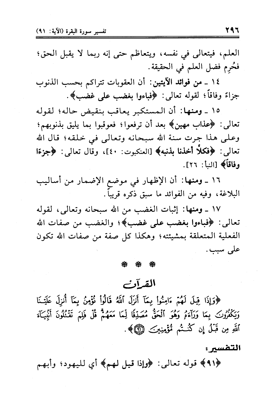 . ١٧ ومنها: إثبات الغضب من الله سبحانه وتعالى، لقوله تعالى: {فباءوا بغضب على غضب}؛ والغضب من صفات الله الفعلية المتعلقة بمشيئته؛ وهكذا كل صفة من صفات الله تكون على سبب ..