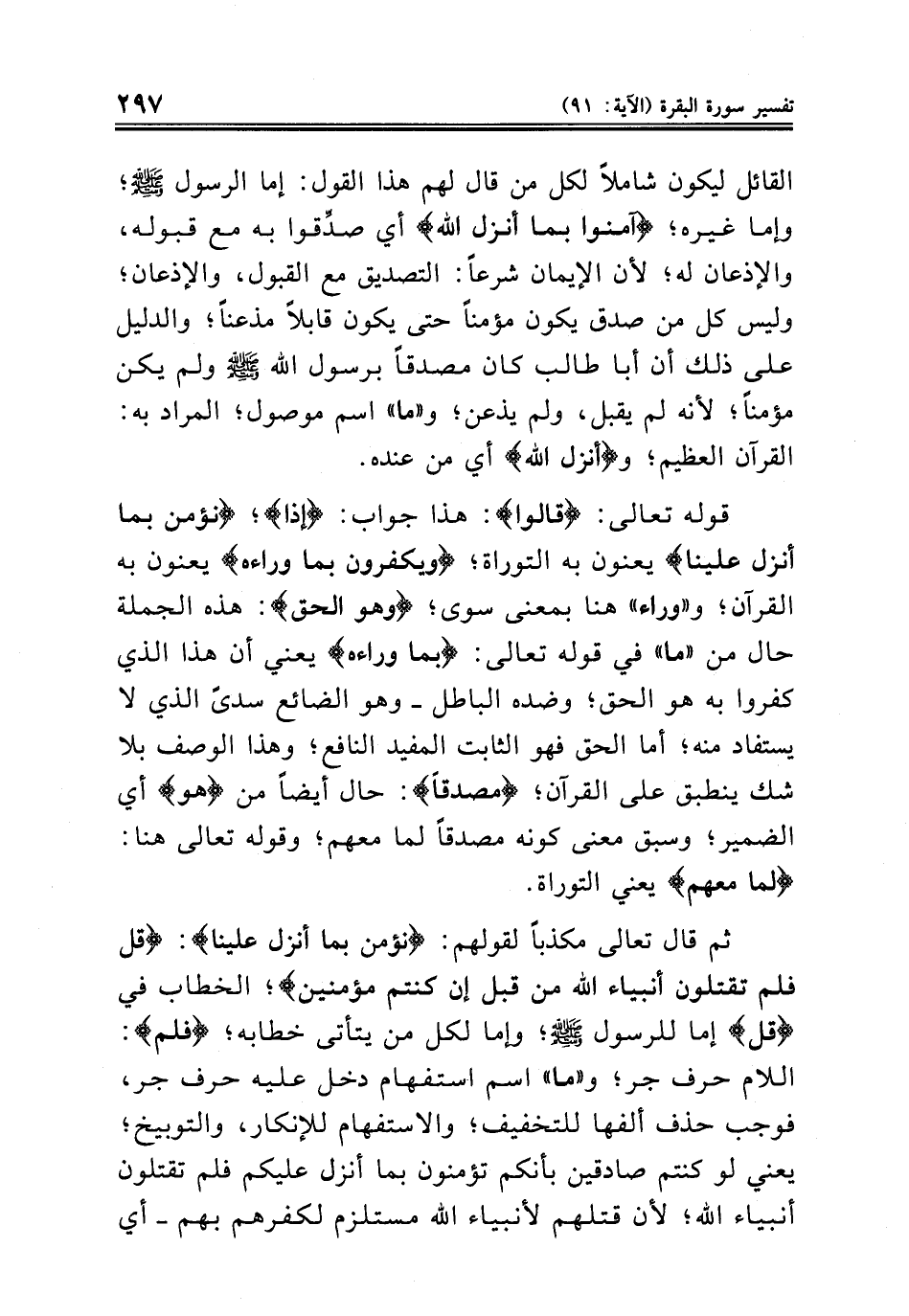 قوله تعالى: {قالوا}: هذا جواب: {إذا}؛ {نؤمن بما أنزل علينا} يعنون به التوراة؛ {ويكفرون بما وراءه} يعنون به القرآن؛ و "وراء" هنا بمعنى سوى؛ {وهو الحق}: هذه الجملة حال من "ما" في قوله تعالى: {بما وراءه} يعني أن هذا الذي كفروا به هو الحق؛ وضده الباطل. وهو الضائع سدىً الذي لا يستفاد منه؛ أما الحق فهو الثابت المفيد النافع؛ وهذا الوصف بلا شك ينطبق على القرآن؛ {مصدقاً}: حال أيضاً من {هو} أي الضمير؛ وسبق معنى كونه مصدقاً لما معهم؛ وقوله تعالى هنا: {لما معهم} يعني التوراة ..