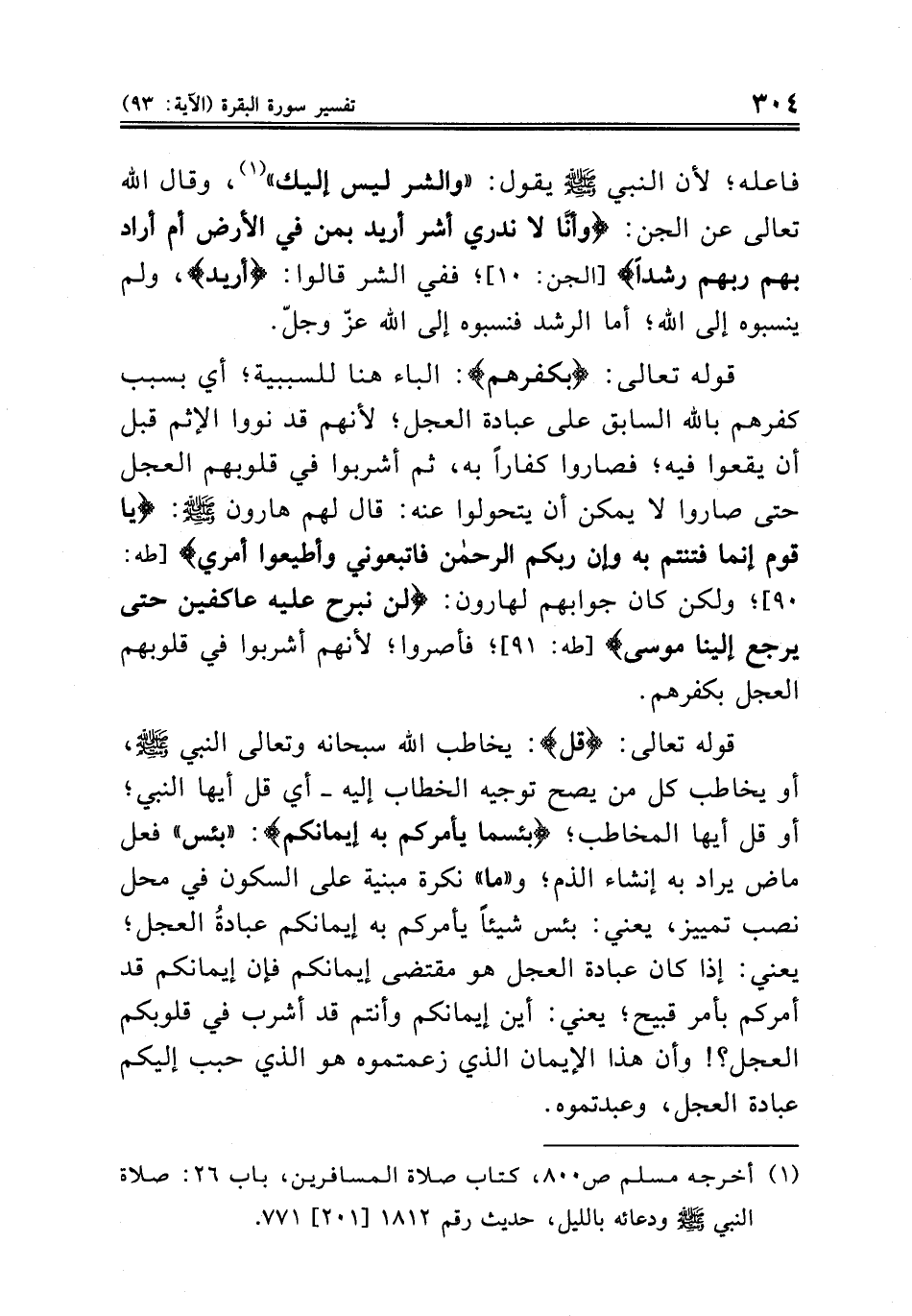 قوله تعالى: {بكفرهم}: الباء هنا للسببية؛ أي بسبب كفرهم بالله السابق على عبادة العجل؛ لأنهم قد نووا الإثم قبل أن يقعوا فيه؛ فصاروا كفاراً به، ثم أشربوا في قلوبهم العجل حتى صاروا لا يمكن أن يتحولوا عنه: قال لهم هارون صلى الله عليه وسلم {يا قوم إنما فتنتم به وإن ربكم الرحمن فاتبعوني وأطيعوا أمري} [طه: ٩٠]؛ ولكن كان جوابهم لهارون: {لن نبرح عليه عاكفين حتى يرجع إلينا موسى} [طه: ٩١]؛ فأصروا؛ لأنهم أشربوا في قلوبهم العجل بكفرهم ..