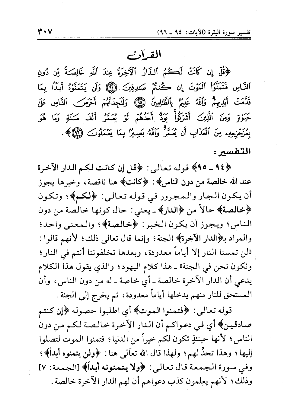 . {٩٤. ٩٥} قوله تعالى: {قل إن كانت لكم الدار الآخرة عند الله خالصة من دون الناس}: {كانت} هنا ناقصة، وخبرها يجوز أن يكون الجار والمجرور في قوله تعالى: {لكم}؛ وتكون {خالصة} حالاً من {الدار}. يعني: حال كونها خالصة من دون الناس؛ ويجوز أن يكون الخبر: {خالصة}؛ والمعنى واحد؛ والمراد بـ {الدار الآخرة} الجنة؛ وإنما قال تعالى ذلك؛ لأنهم قالوا: "لن تمسنا النار إلا أياماً معدودة، وبعدها تخلفوننا أنتم في النار؛ ونكون نحن في الجنة". هذا كلام اليهود؛ والذي يقول هذا الكلام يدعي أن الدار الآخرة خالصة. أي خاصة. له من دون الناس، وأن المستحق للنار منهم يدخلها أياماً معدودة، ثم يخرج إلى الجنة ..