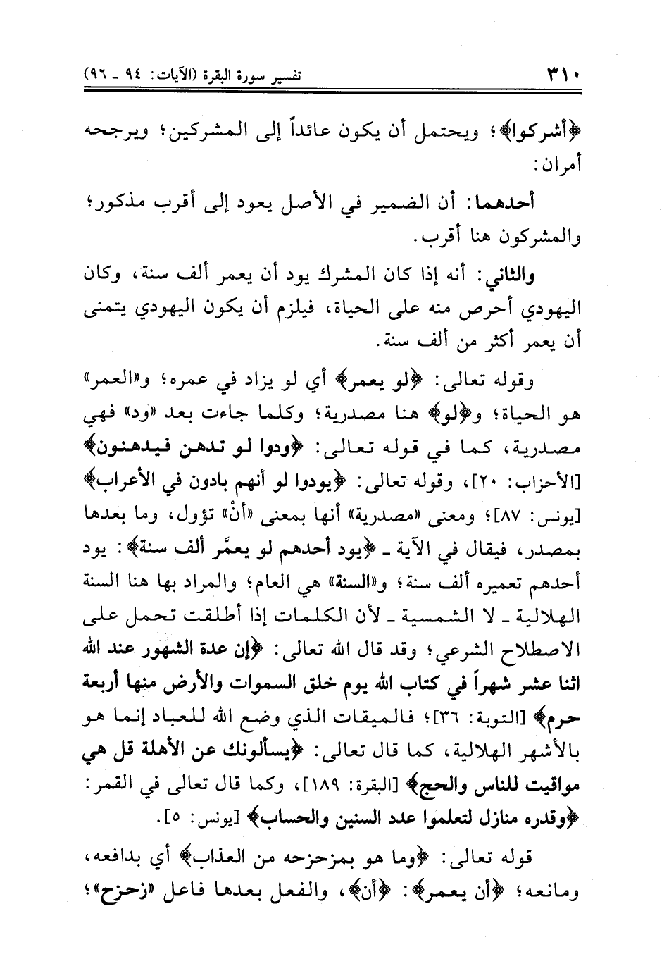 {يودوا لو أنهم بادون في الأعراب} [الأحزاب: ٢٠]؛ ومعنى "مصدرية" أنها بمعنى "أنْ" تؤول، وما بعدها بمصدر، فيقال في الآية. {يود أحدهم لو يعمَّر ألف سنة}: يود أحدهم تعميره ألف سنة؛ و "السنة" هي العام؛ والمراد بها هنا السنة الهلالية. لا الشمسية. لأن الكلمات إذا أطلقت تحمل على الاصطلاح الشرعي؛ وقد قال الله تعالى: {إن عدة الشهور عند الله اثنا عشر شهراً في كتاب الله يوم خلق السموات والأرض منها أربعة حرم} [التوبة: ٣٦]؛ فالميقات الذي وضع الله للعباد إنما هو بالأشهر الهلالية، كما قال تعالى: {يسألونك عن الأهلة قل هي مواقيت للناس والحج} [البقرة: ١٨٩]، وكما قال تعالى في القمر: {وقدره منازل لتعلموا عدد السنين والحساب} [يونس: ٥] ..
