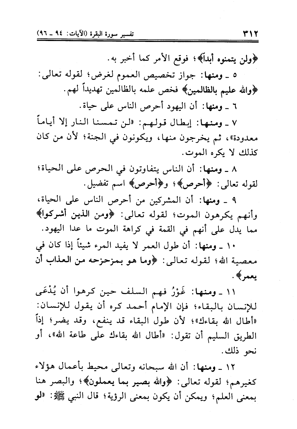 . ٩ ومنها: أن المشركين من أحرص الناس على الحياة، وأنهم يكرهون الموت؛ لقوله تعالى: {ومن الذين أشركوا} مما يدل على أنهم في القمة في كراهة الموت ما عدا اليهود ..
