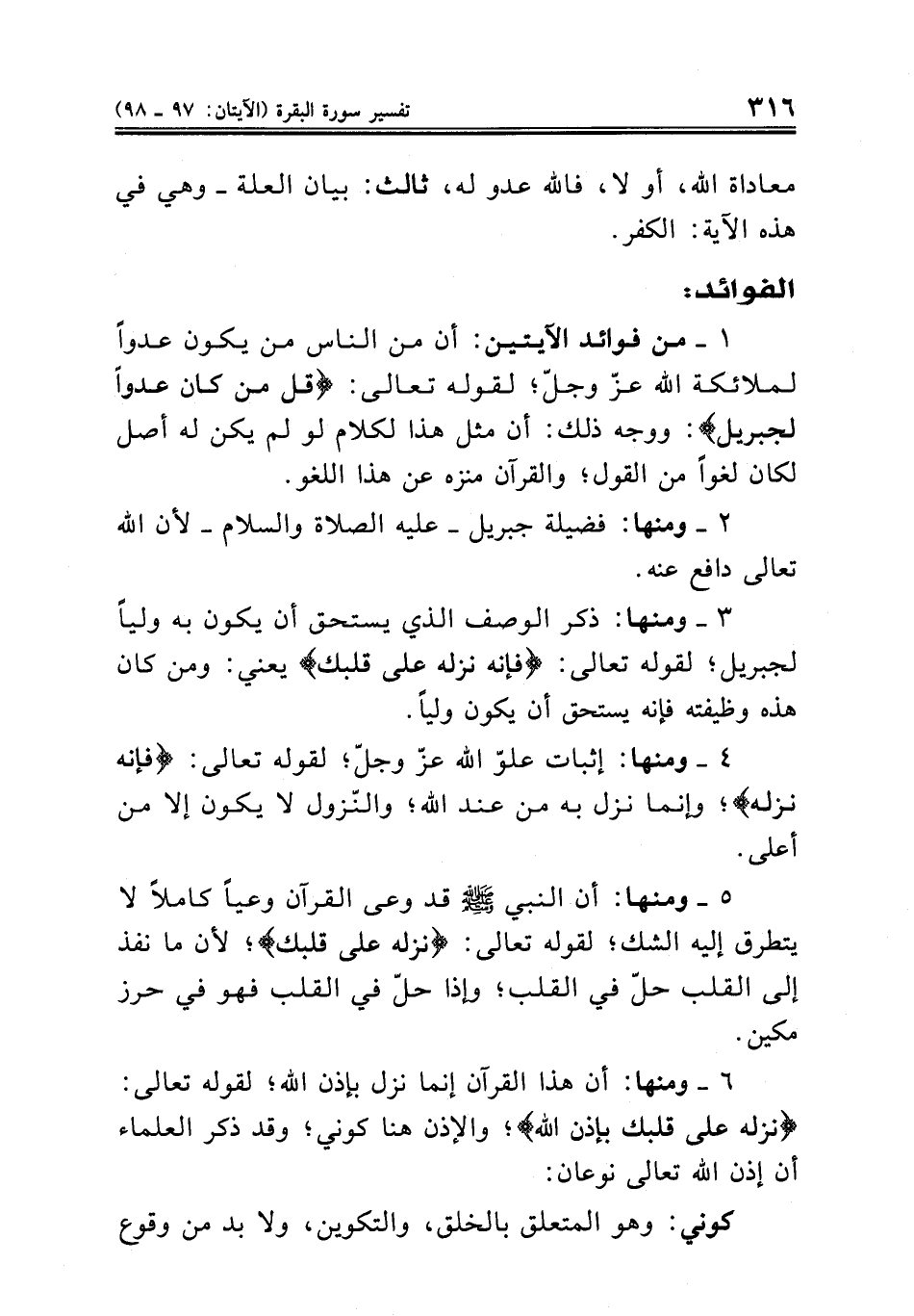 . ٣ ومنها: ذكر الوصف الذي يستحق أن يكون به ولياً لجبريل؛ لقوله تعالى: {فإنه نزله على قلبك} يعني: ومن كان هذه وظيفته فإنه يستحق أن يكون ولياً ..