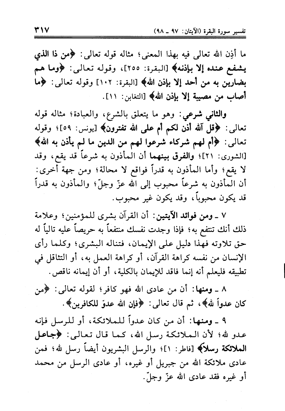 والثاني شرعي: وهو ما يتعلق بالشرع، والعبادة؛ مثاله قوله تعالى: {قل آلله أذن لكم أم على الله تفترون} [يونس: ٥٩]؛ وقوله تعالى: {أم لهم شركاء شرعوا لهم من الدين ما لم يأذن به الله} [الشورى: ٢١]؛ والفرق بينهما أن المأذون به شرعاً قد يقع، وقد لا يقع؛ وأما المأذون به قدراً فواقع لا محالة؛ ومن جهة أخرى: أن المأذون به شرعاً محبوب إلى الله عزّ وجلّ؛ والمأذون به قدراً قد يكون محبوباً، وقد يكون غير محبوب ..