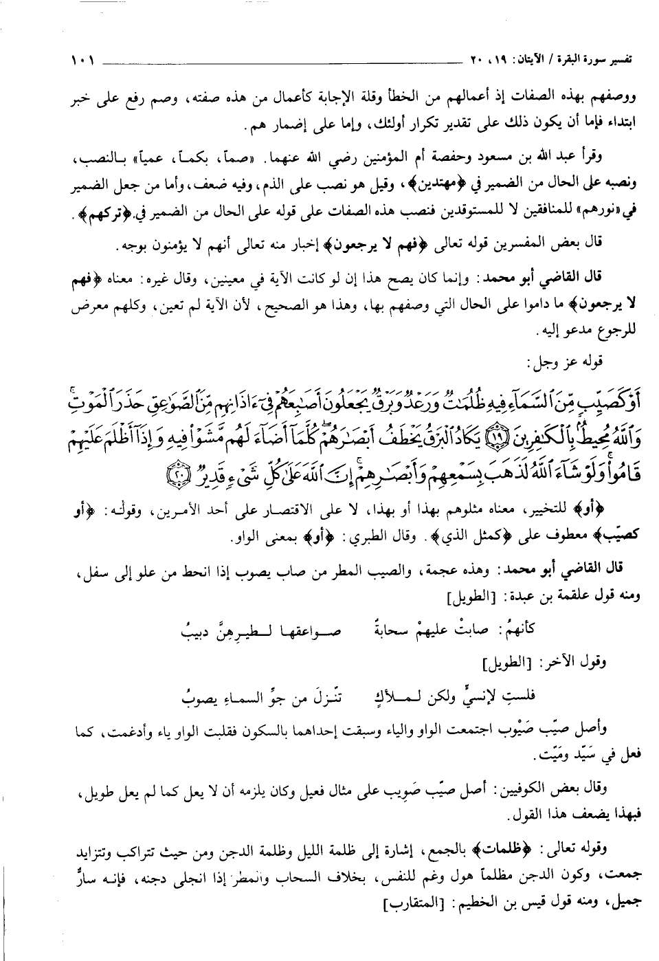 أَوْ كَصَيِّبٍ مِنَ السَّماءِ فِيهِ ظُلُماتٌ وَرَعْدٌ وَبَرْقٌ يَجْعَلُونَ أَصابِعَهُمْ فِي آذانِهِمْ مِنَ الصَّواعِقِ حَذَرَ الْمَوْتِ وَاللَّهُ مُحِيطٌ بِالْكافِرِينَ (١٩) يَكادُ الْبَرْقُ يَخْطَفُ أَبْصارَهُمْ كُلَّما أَضاءَ لَهُمْ مَشَوْا فِيهِ وَإِذا أَظْلَمَ عَلَيْهِمْ قامُوا وَلَوْ شاءَ اللَّهُ لَذَهَبَ بِسَمْعِهِمْ وَأَبْصارِهِمْ إِنَّ اللَّهَ عَلى كُلِّ شَيْءٍ قَدِيرٌ (٢٠)