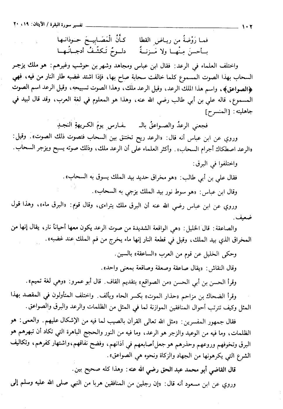 فقال جمهور المفسرين: «مثل الله تعالى القرآن بالصيب لما فيه من الإشكال عليهم. والعمى: هو الظلمات، وما فيه من الوعيد والزجر هو الرعد، وما فيه من النور والحجج الباهرة التي تكاد أن تبهرهم هو البرق وتخوفهم وروعهم وحذرهم هو جعل أصابعهم في آذانهم، وفضح نفاقهم، واشتهار كفرهم، وتكاليف الشرع التي يكرهونها من الجهاد والزكاة ونحوه هي الصواعق» .